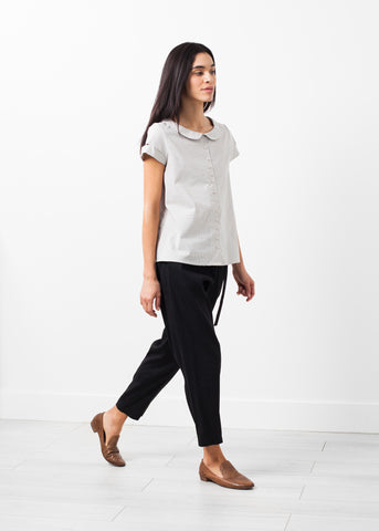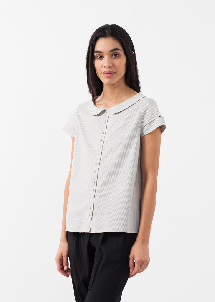 The Rudolf is a pretty top for any apparel needs. Button placket closure at front. Capped sleeves. Wide Peter Pan collar. Lilith. Color Fog. 67% Cotton, 33% Anidex. Ashley is wearing an X-Small.